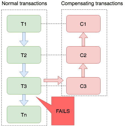 Saga 模式是长事务解决方案,业务流程中每个节点都应该有对应的补偿操作,当全局事务需要回滚时,应通知已提交的参与者进行补偿操作。适用于业务流程长、包含第三方服务的情况。例如,下单 → 付款 → 发货,当发货节点失败,全局事务需要回滚时,应当进行的反向补偿操作是退款、修改订单状态。