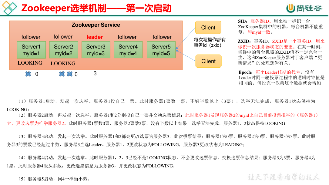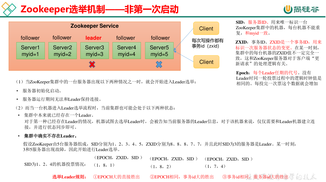 第一次启动时比较的是 myid,而非第一次启动时 (leader 宕机),原则是谁的数据最新则选谁为 leader,即 order by zxid, myid desc。