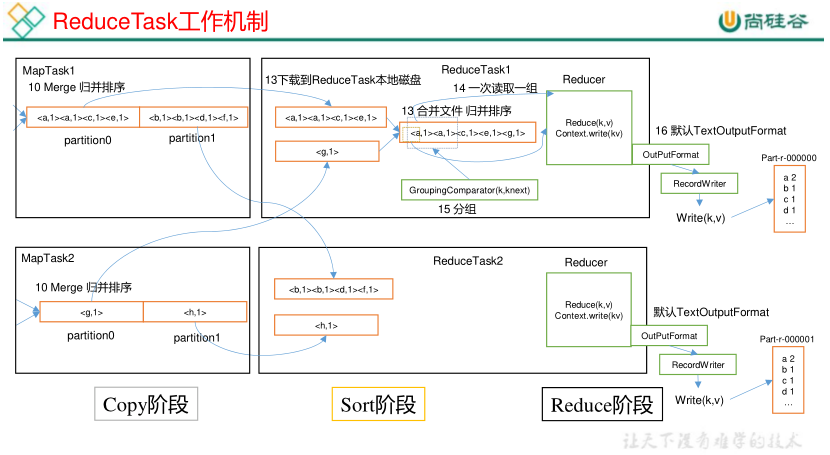 - Sort 阶段:在远程拷贝数据的同时,ReduceTask 启动了两个后台线程对内存和磁盘上的文件进行合并,以防止内存使用过多或磁盘上文件过多。按照 MapReduce 语义,用户编写 reduce() 函数输入数据是按 key 进行聚集的一组数据。为了将 key 相同的数据聚在一起,Hadoop 采用了基于排序的策略。由于各个 MapTask 已经实现对自己的处理结果进行了局部排序,因此,ReduceTask 只需对所有数据进行一次归并排序即可;