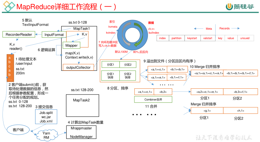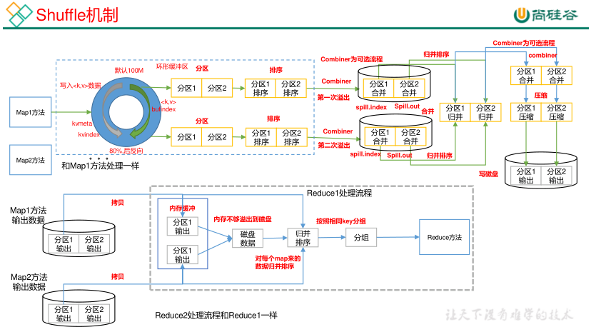 - Merge 阶段:当所有数据处理完成后,MapTask 对所有临时文件进行一次合并,以确保最终只会生成一个数据文件。
