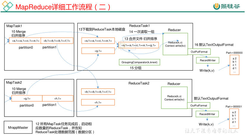 - ReduceTask 会抓取到同一个分区的来自不同 MapTask 的结果文件,ReduceTask 会将这些文件再进行合并(归并排序);