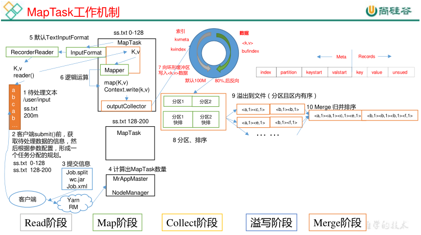 - Read 阶段:MapTask 通过 InputFormat 获得的 RecordReader,从输入 InputSplit 中解析出一个个 key/value;