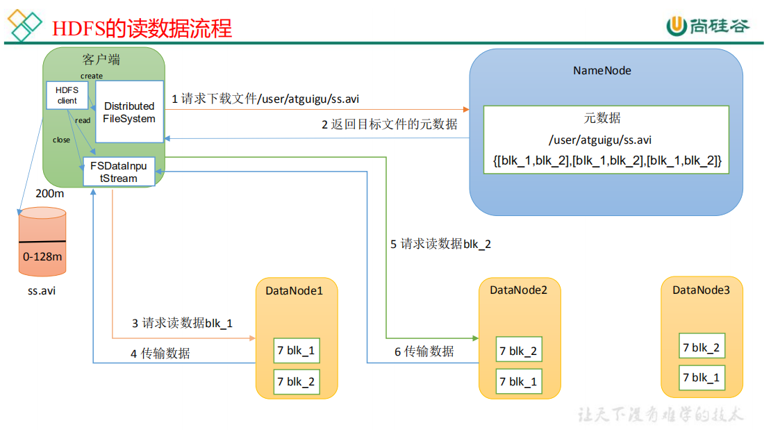 - Client 读取数据块写入目标文件 (如果校验失败则从其他 DN 重新下载)。