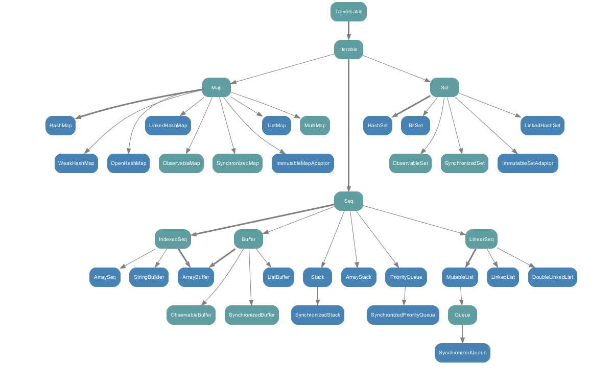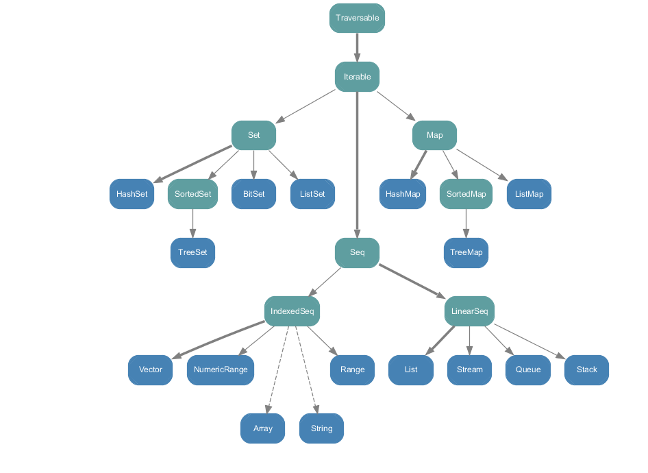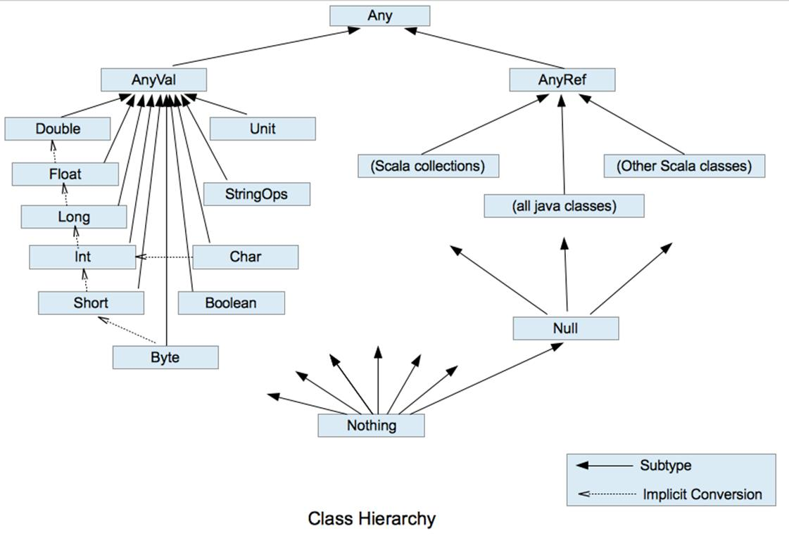 图中实线表示继承,虚线表示隐式转换,Any 是所有类的父类,AnyVal 值类型,AnyRef 引用类型。