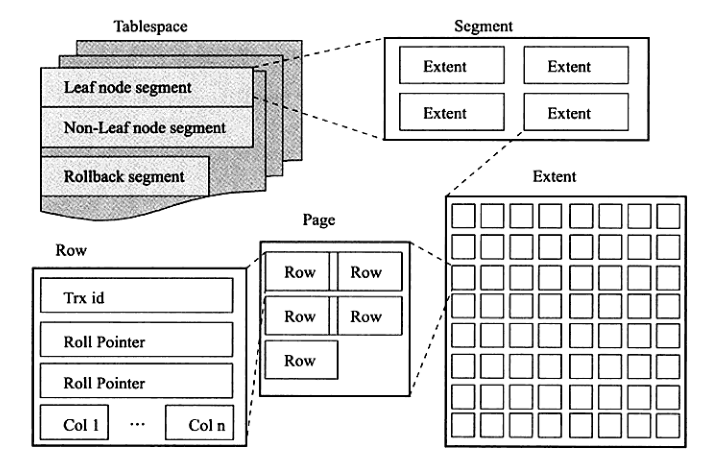 如上图所示,InnoDB 的逻辑存储结构包括:表空间、段、区、页、行。类似操作系统内存管理中的段页式存储管理,InnoDB 引擎将数据存放在表空间中,表空间中根据功能不同又有不同分段,如数据段、索引段、回滚段等,每一段中又进行分区,分区的目的是合理组织数据页,数据页中放的是真实的一行行数据。