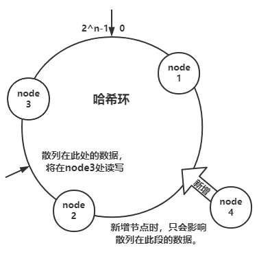 一致性哈希,是指将 节点与数据 都映射到一个 首尾相连的哈希环 上,如我们可以取对 2 ^n 次方取模(x % 2^n 可以简化为 x ^ (2^n - 1))作为哈希函数,当读写数据时,将 key 经过散列后可定位在哈希环上的某一位置,往顺时针方向找第一个节点,即为要读写的节点。