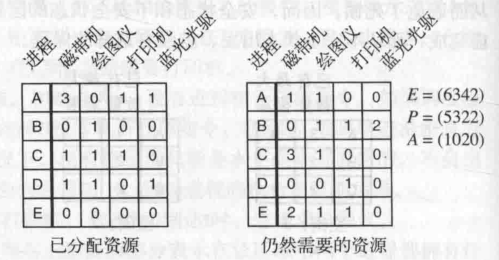 显然,某时刻 E - 分配矩阵的所有行 = A,用 A 和请求矩阵的每一行相比较,即能发现将资源分配给哪一个进程可以避免死锁。