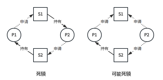 如上左图所示,P1 占有资源 S2 又请求 S1,P2 占有资源 S1 又请求 S2,资源分配图形成了一个环路,即发生死锁。