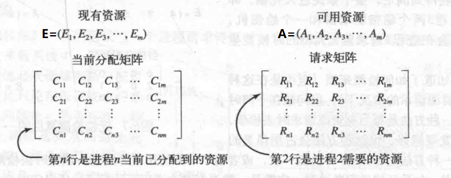 如图所示,共有 m 种资源,向量 E 表示每种资源的总数,向量 A 表示某一时刻每种资源的可用个数;左边为分配矩阵,每行表示一个进程已经获得的对应资源的个数;右边为请求矩阵,每一行表示一个进程仍需要对应资源的个数才能运行。